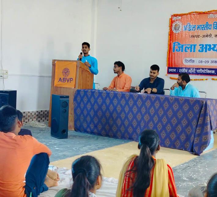 अमेठी ।अखिल भारतीय विद्यार्थी परिषद जनपद अमेठी का जिला अभ्यास वर्ग स्थानीय कस्बा स्थित राजीव गांधी पॉलिटेक्निक मे संपन्न हुआ। मुख्य अतिथि राष्ट्रीय कार्यकारिणी सदस्य रमेश सिंह पटेल ने अपने विचार रखे। शुभारंभ प्रथम सत्र में प0प्रांत सह सोशल मीडिया संयोजक एवं जिला सहसंयोजक राहुल कौशल विद्यार्थी ने मंच का संचालन किया वही शुभारंभ सत्र में राजीव गांधी पॉलिटेक्निक के प्रबंधक भवानी प्रसाद दुबे ने दीप प्रज्वलित कर कार्यक्रम का शुभारंभ किया । मुख्य अतिथि रमेश सिंह पटेल ने कहा कि एबीपी किसी दल या संगठन के लिए नहीं बल्कि छात्र हितों के लिए कार्य करती है संगठन के विभिन्न स्थानों से आए सैकड़ों छात्रों को संबोधित करते हुए रमेश ने कार्यकर्ताओं को अधिक से अधिक छात्रों तक पहुंचकर राष्ट्रभक्ति की भावना जागृत करने व छात्र हितों के लिए सदैव संघर्षरत रहने का गुरु मंत्र दिया । इसी क्रम में सुल्तानपुर विभाग के विभाग प्रमुख संतोष जी ने कहा कि स्थापना काल से ही संगठन ने छात्र हित और राष्ट्र हित से जुड़े प्रश्नों को प्रमुखता से उठाया है और देशव्यापी आंदोलनों का नेतृत्व किया है। अखिल भारतीय विद्यार्थी परिषद् ने छात्र-हित से लेकर भारत के व्यापक हित से सम्बद्ध समस्याओं की ओर बार-बार ध्यान दिलाया है। बांग्लादेशी अवैध घुसपैठ और कश्मीर से धारा 370 को हटाने के लिए विद्यार्थी परिषद् समय-समय पर आन्दोलन चलाता रहा है। जिला संयोजक प्रियम त्रिपाठी ने छात्रों को एबीवीपी से जुड़कर छात्र हित में कार्य करने के लिए प्रोत्साहित किया I